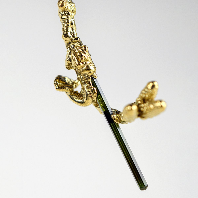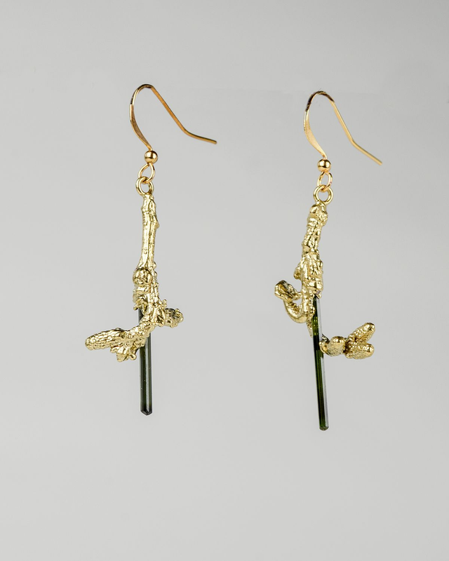 Tourmalines de Madagascar, fragment d'ostryer à feuilles de charme, cuivré puis plaqué or.